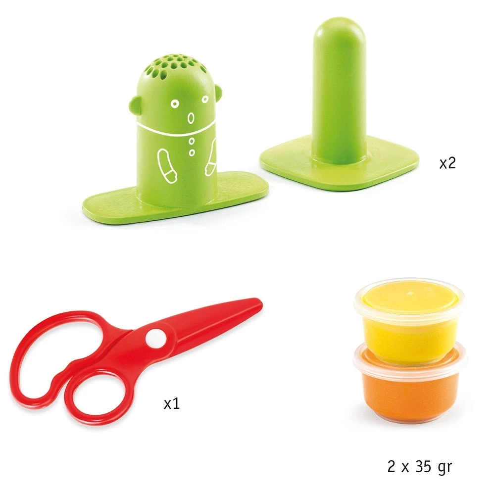 Een leuke DJECO kappersset ideaal als uitbreiding bij de soft klei. De set bestaat uit 2 holle popjes (5 cm) waar je een bolletje klei in stopt. Schuif de popjes over de standaard en hun haar begint te groeien. Met de schaar knip je de allermooiste kapsels.