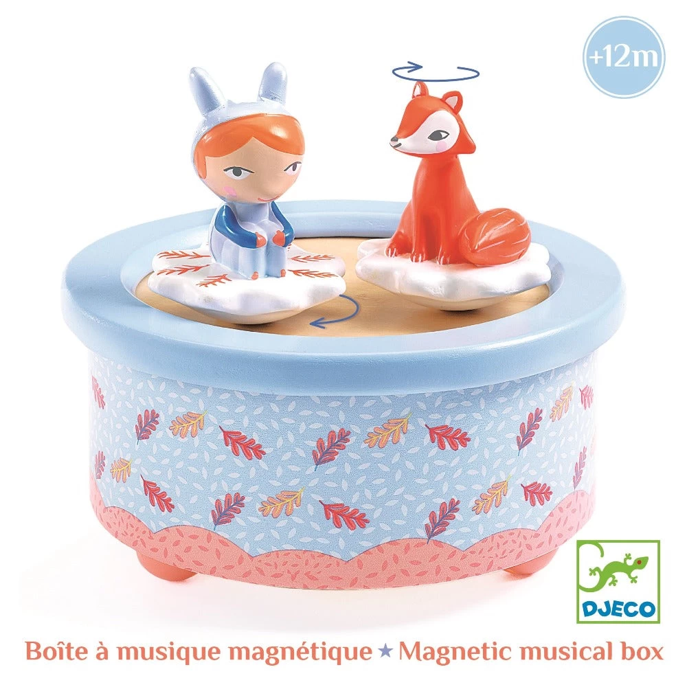 Een houten DJECO muziekdoosje met een prachtig vosje en popje. Plaats de figuren op het magnetisch muziekdoosje Fox en wind deze op, terwijl het Wiegenlied van Schubert speelt, draaien de figuurtjes rond.