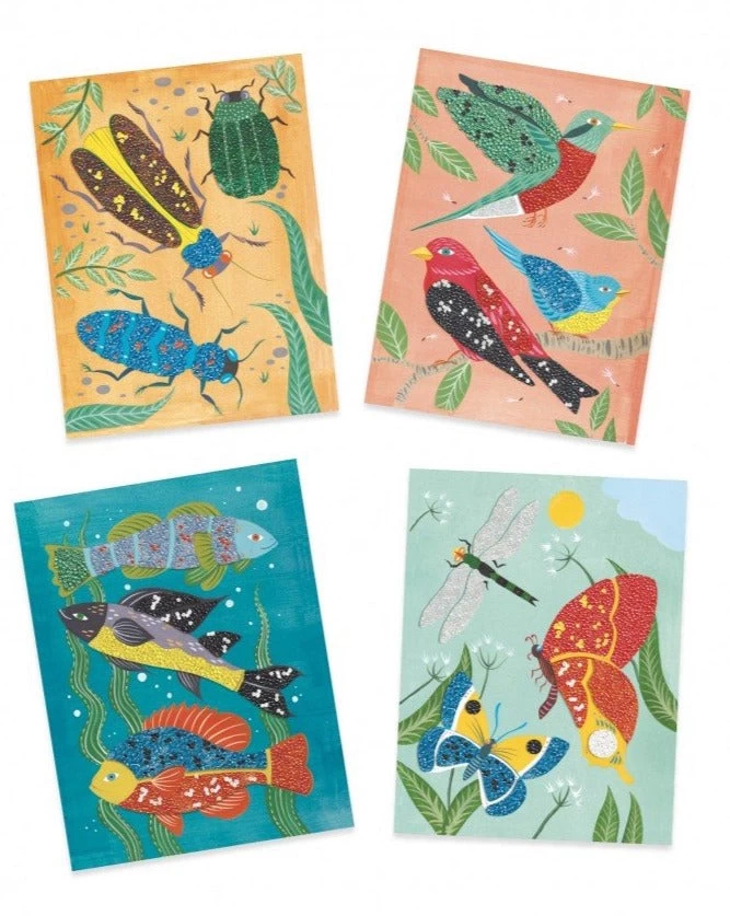 Met dit DJECO knutselpakket maak de mooiste schilderijen met een prachtig resultaat: glanzende vogels en insecten. Kies uit 1 van de 4 dierenkaarten en breng lijm aan op een vak in de kaart. Leg de kaart in de doos en strooi de kralen op de plakbare plekken. Gebruik 1 kleur of maak een patroon, de meegeleverd stukjes zorgen dat je heel precies kunt werken.