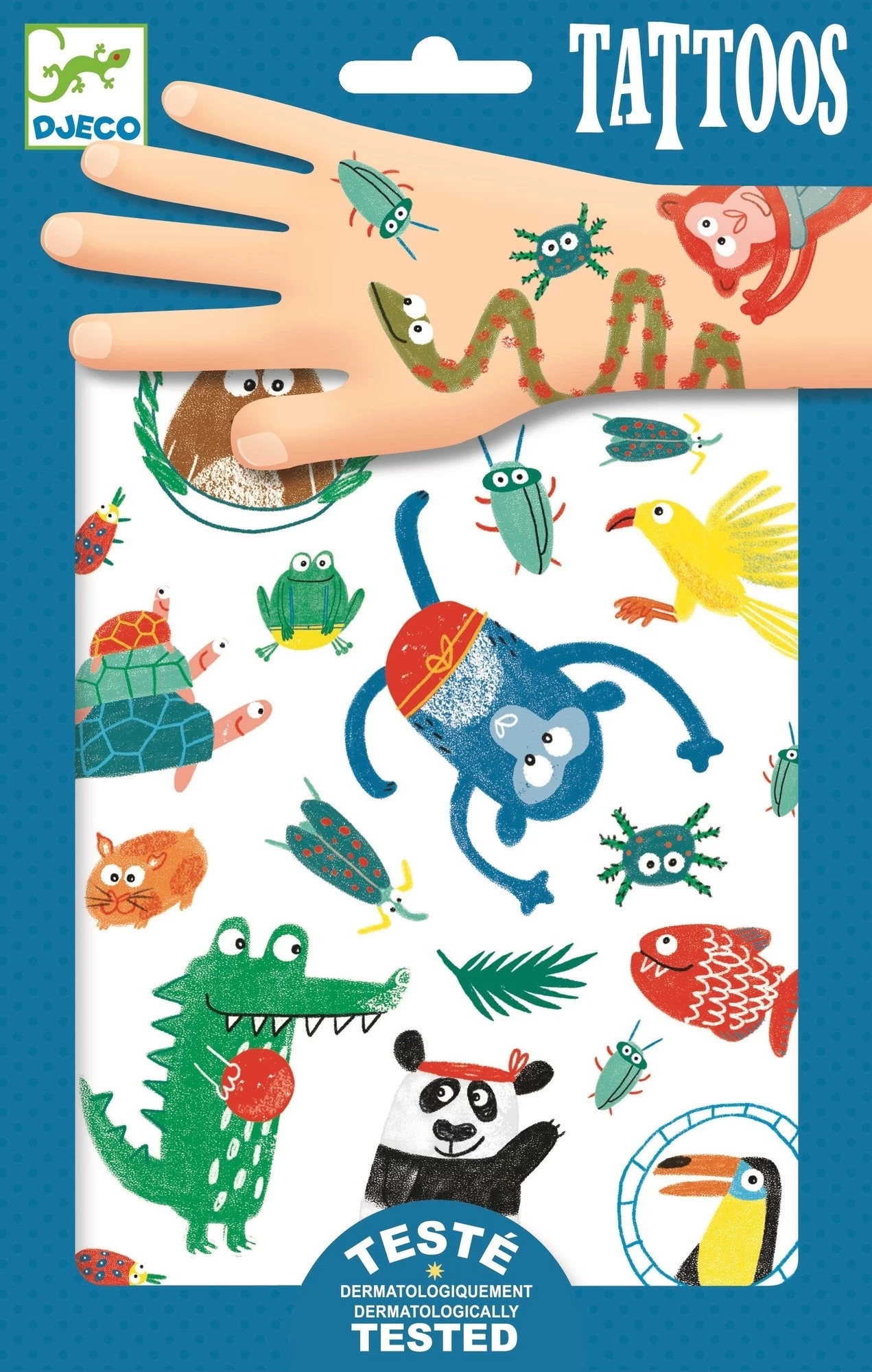 DJECO kindertattoo’s met gekke dieren, welke vind jij de leukste? Knip de tijdeliojke tattoo’s uit en breng ze in een handomdraai aan op de huid, nat doekje erop en klaar. Een oude tattoo verwijder je het beste met een klein beetje babyolie.