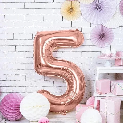 XL folie ballon cijfer 5, deze metallic roze cijfer ballon kan gevuld worden met helium of lucht. Een cijfer folie ballon is de perfecte decoratie voor elke verjaardag! Met de losse cijfers vorm je de leeftijd van de jarige.