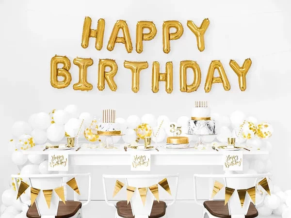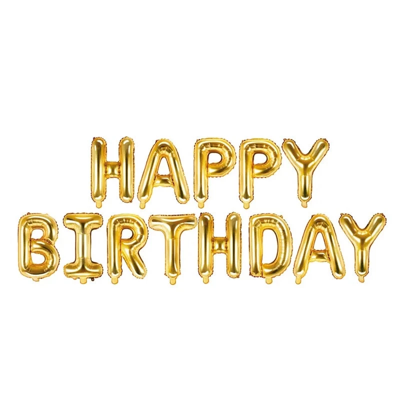 Gouden folie ballon slinger met 13 ballonnen die samen de woorden Happy Birthday vormen. De folie ballonnen kunnen gevuld worden met helium of lucht. De 13 metallic gouden ballonnen zijn 35 cm hoog, de totale lengte van de slinger is 340 cm.
