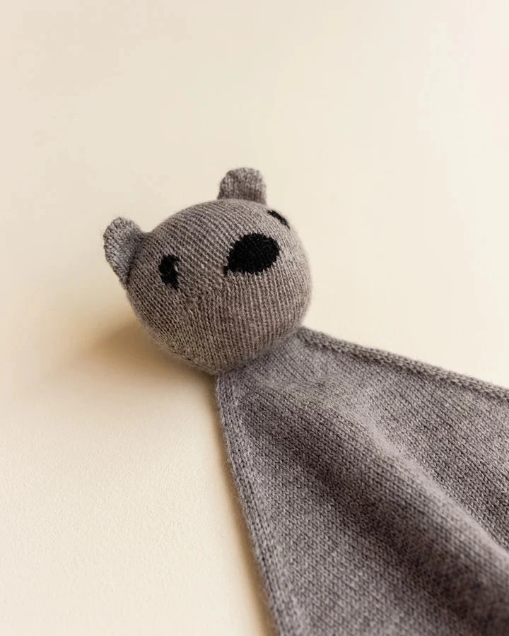 HVID knuffeldoekje beer Teddy tokki otter taupe gemaakt van de zachtste merino wol, deze neemt de geur van jouw baby op en voelt heerlijk vertrouwd. Het lijfje van het HVID knuffeldoekje is 28 x 45 cm, aan de onderkant zit een knuffelknoop. Het hoofdje van de beer is gevuld met bio merino, de oogjes en het neusje zijn ingebreid.