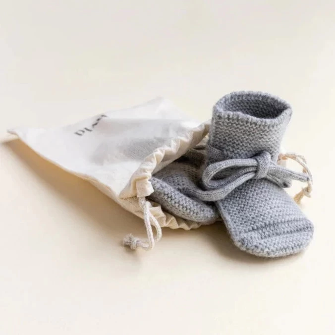 HVID slofjes van merinowol grey melange geschikt voor kindjes 9-15 maanden. Warme HVID slofjes met een fijne pasvorm precies wat je zoekt om de voetjes van je baby warm en beschermd te houden! De slofjes zijn verpakt in een katoenen zakje, heel geschikt als kraamcadeautje,