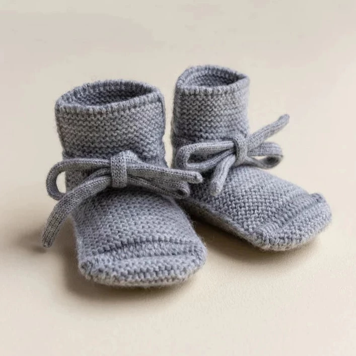 De babyslofjes zijn gebreid in 100% merino in ribbel knit samen zorgen zij voor extra elasticiteit en rekbaarheid zonder de vorm van de slofjes te verliezen. De baby booties hebben een echte hielvorm, dit zorgt voor een goede pasvorm. Ze blijven goed aan het voetje zitten door de gebreide veter die kan strikken.