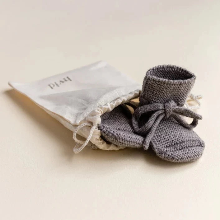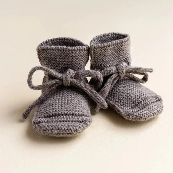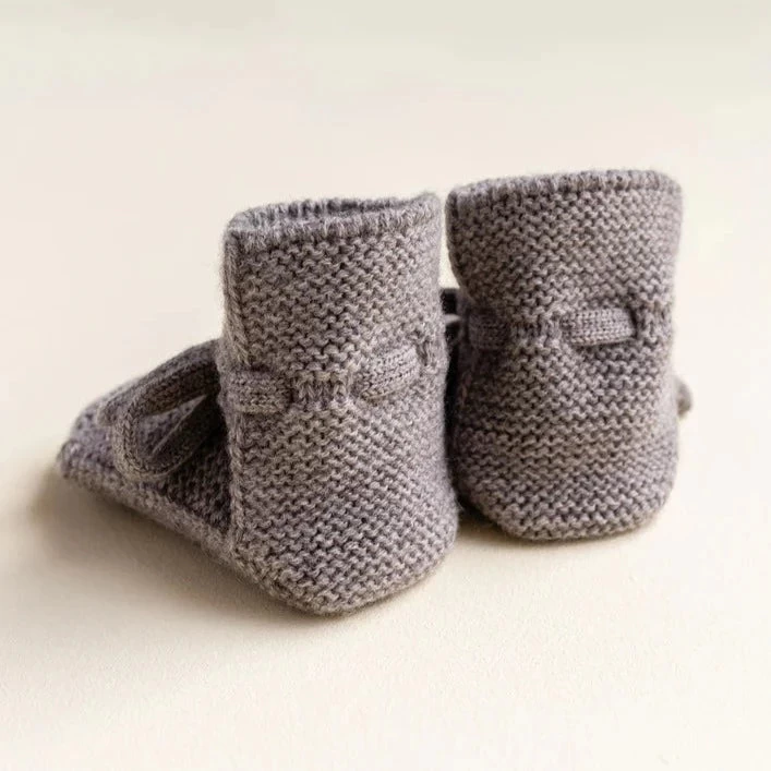 De babyslofjes zijn gebreid in 100% merino in ribbel knit samen zorgen zij voor extra elasticiteit en rekbaarheid zonder de vorm van de slofjes te verliezen. De baby booties hebben een echte hielvorm, dit zorgt voor een goede pasvorm. Ze blijven goed aan het voetje zitten door de gebreide veter die kan strikken.