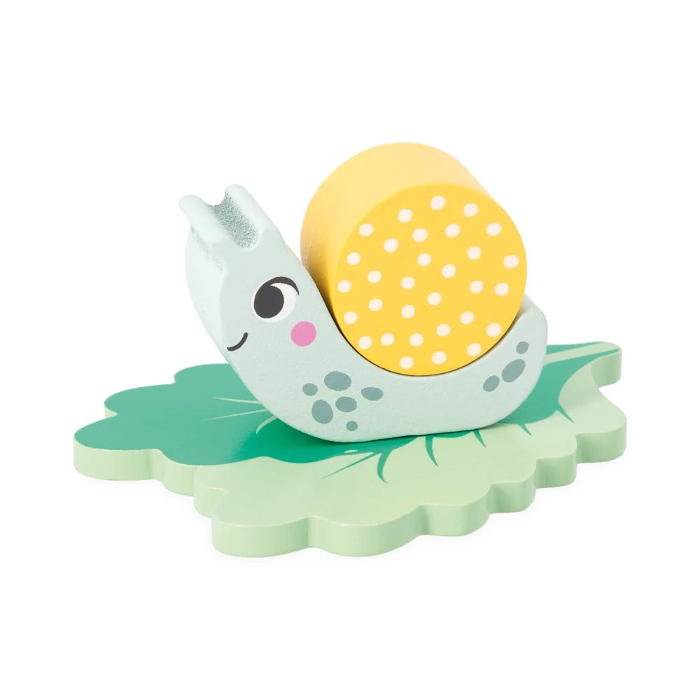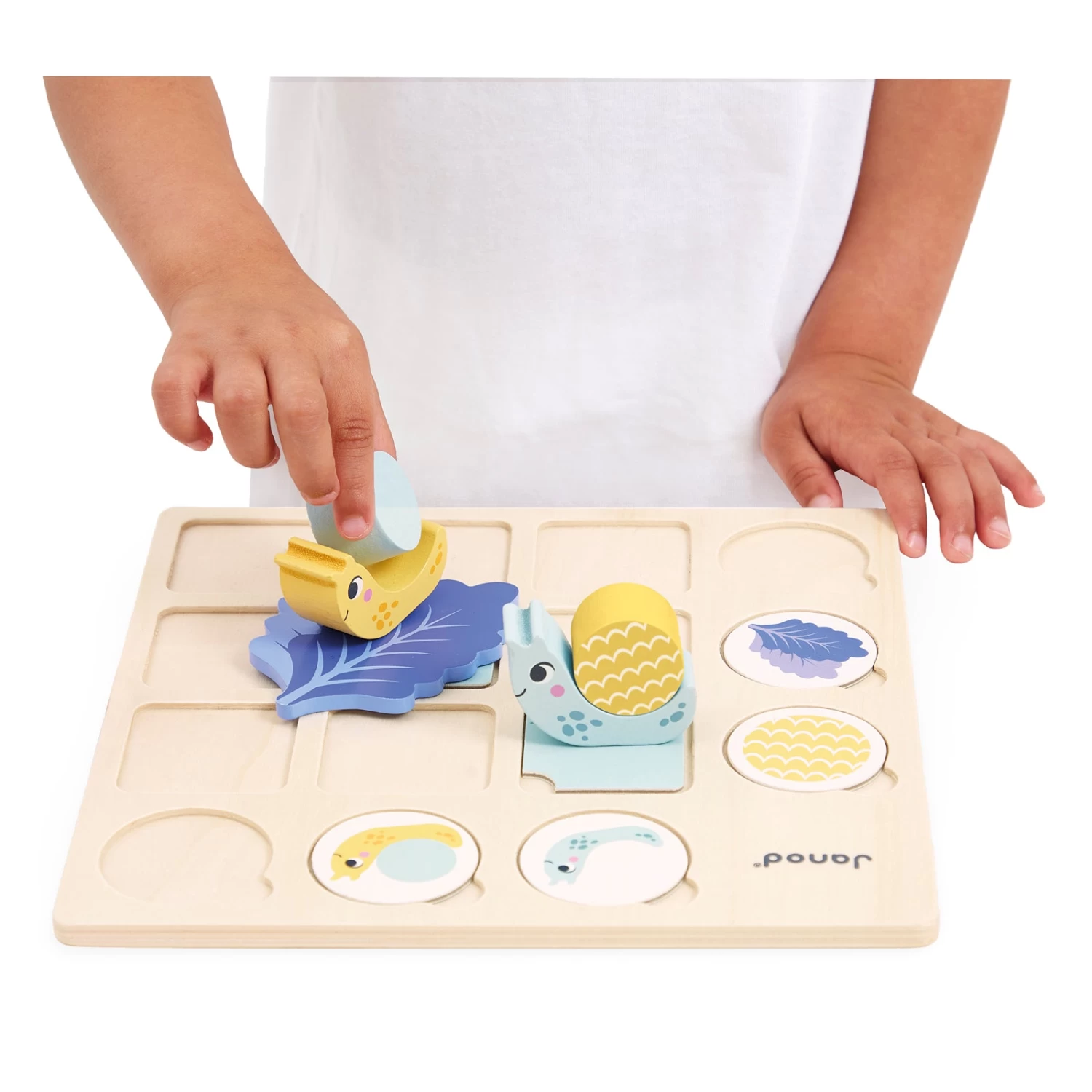 JANOD cijferspel uit de Pedagogie serie, een educatief spel voor peuters vanaf 3 jaar om spelenderwijs kennis te maken met tabellen en het logisch denken te stimuleren. Door de tabel goed te bekijken weet je welke slak je mag bouwen!