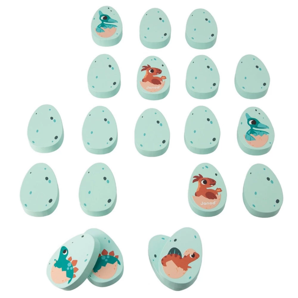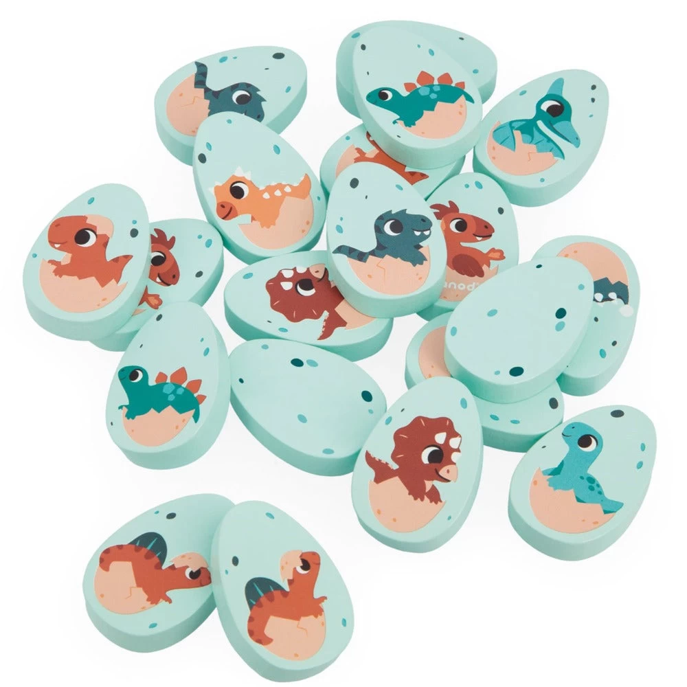 JANOD houten memory spel met 20 dino eieren waarmee je 10 paren maakt. De grote speelstukken met dieren zijn geschikt voor kinderen vanaf 2 jaar.