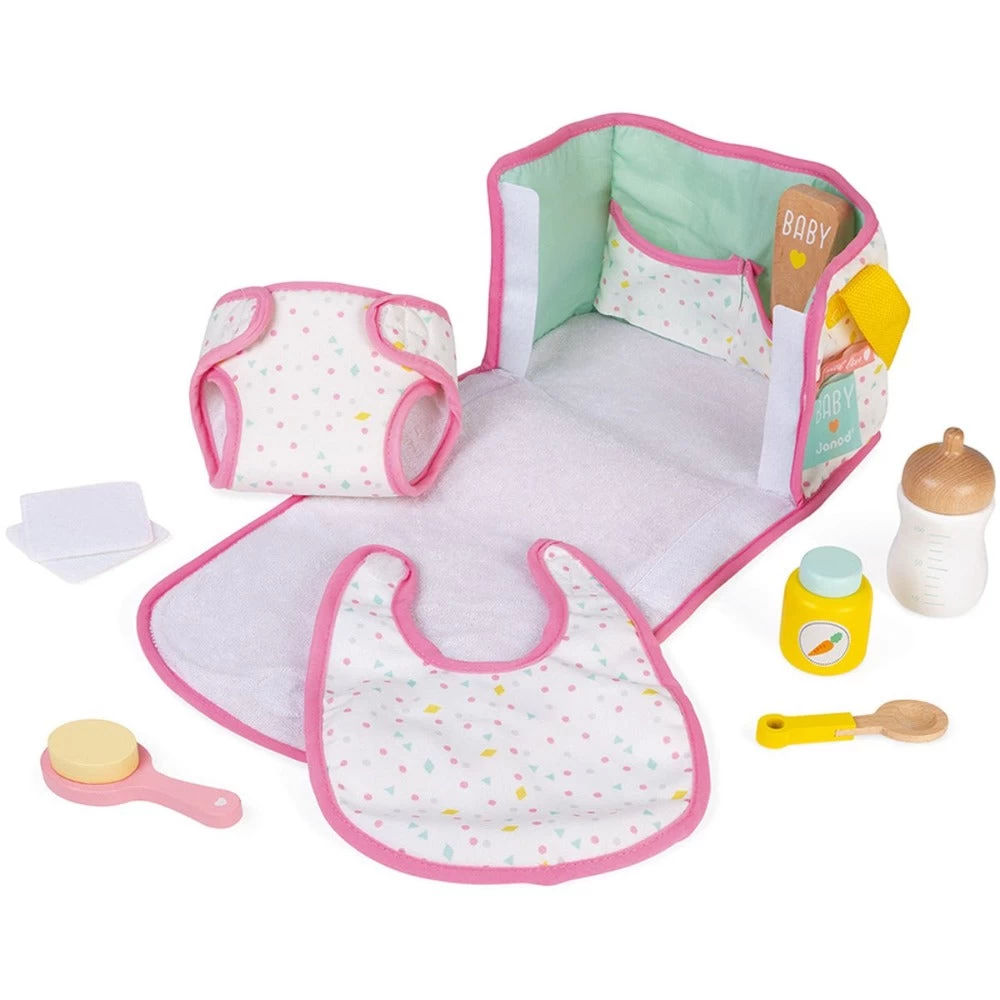 Deze JANOD verschoningstas is een complete speelgoed set voor elke poppenmoeder en -vader om hun knuffels en poppen te verzorgen. Dit 9 delige pretend and play speelgoed bevordert de fantasie van je kind. In de uitvouwbare tas zit alles wat je nodig hebt om je babypop te verzorgen.