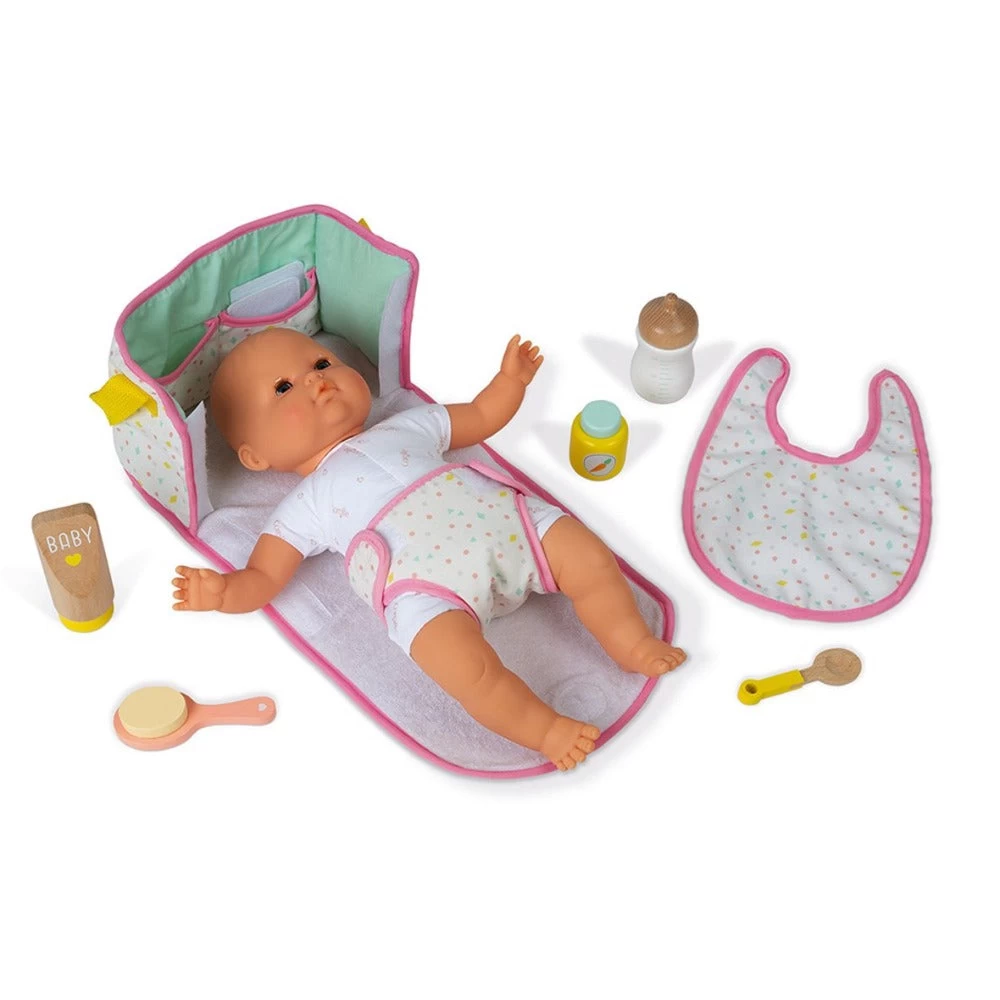 Heeft je babypop honger of een schone luier nodig? Dan vind je alles wat je nodig hebt in deze tas van 20 x 9 x 12.5 cm vol houten speelgoed verzorgingsproducten. Vouw de tas open en gebruik hem als verschoonmat. De pop wordt niet meegeleverd.