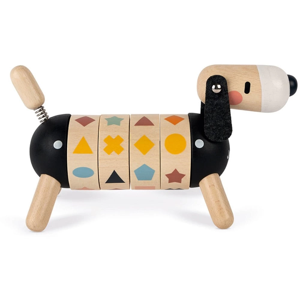 De vormen en kleuren hond van JANOD, een houten spel uit de sweet cocoon serie waarmee peuters kleuren en vormen leren herkennen.