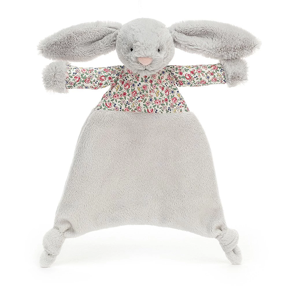Jellycat knuffeldoekje Blossom bunny silver is een superzachte knuffeldoek in de vorm van een grijs konijntje. Het gebloemde lijfje en de lange oren en poten maken van dit doekje de perfecte knuffel.