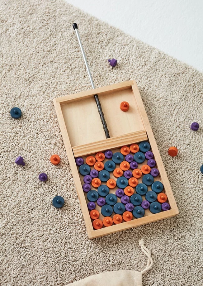 Trek aan de stok zodat de veer gespannen staat. Vul de houtenbak met blokjes en het spel kan beginnen. Verzamel zoveel mogelijk blokjes todat de veer springt. Tel de blokjes en kijk wie de meeste punten heeft. Dat is de winnaar!