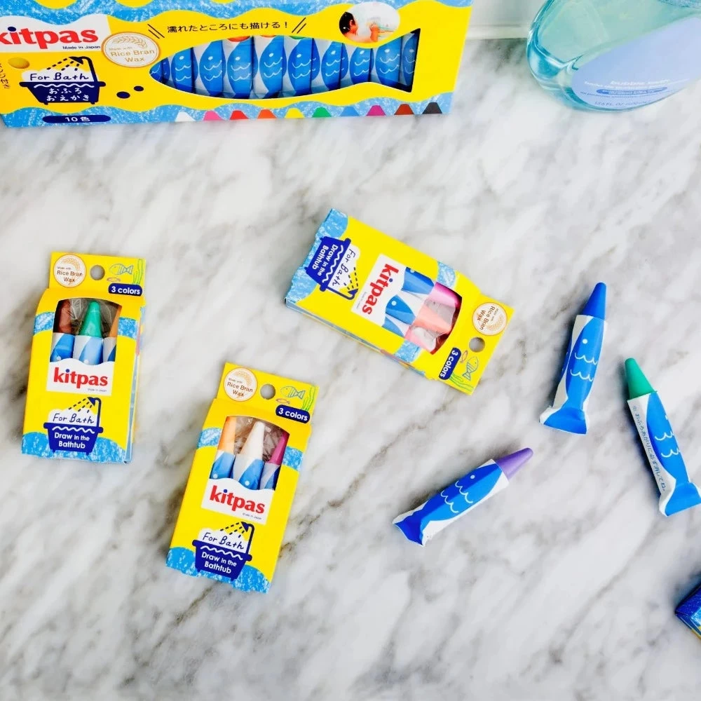 Kitpas badkrijtjes in 3 kleuren bruin, mintgroen en geel, badspeelgoed voor creatieve kinderen die zelfs tijdens het badderen willen kleuren! De badkrijtjes zijn zeshoekig en hebben een waterbestendige wikkel met een vis erop.