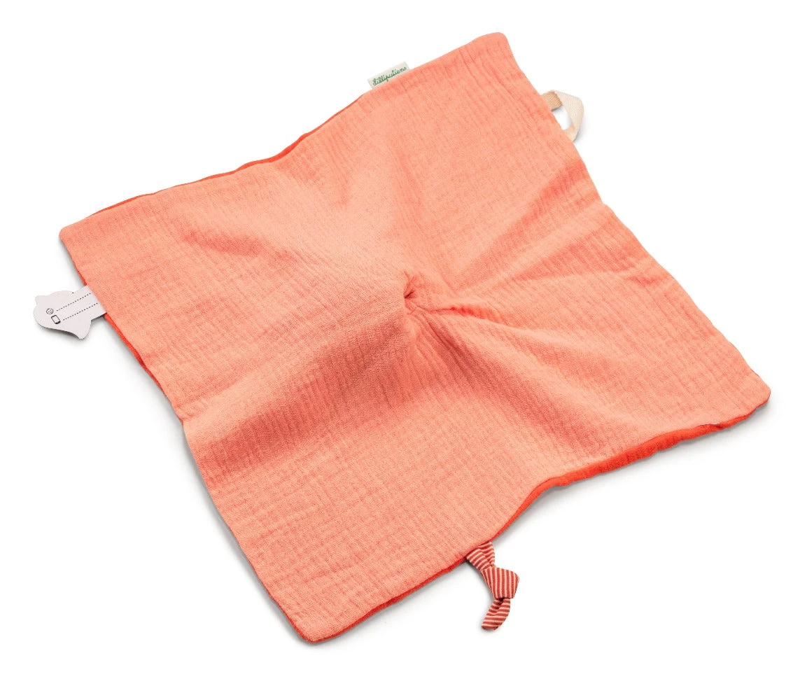 Lilliputiens knuffeldoekje met het hoofdje van Stella het hertje. Het koraalrode knuffeldoekje is gemaakt van organisch katoen en zacht als een hydrofiele doek. Aan het knuffeldoekje zit een labeltje in de vorm van een vogeltje en een striklint om een speen aan het doekje vast te knopen.