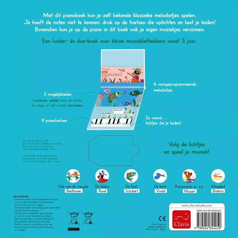 In dit muziekboek vind je 6 verschillende stukjes uit klassieke muziekstukken. Met een knopje bepaal je zelf wat je wilt doen: de muziekjes luisteren, spelen of zelf een muziekje verzinnen. De piano heeft 9 verschillende toetsen, elke toets heeft een klein open rondje. Druk erop en je hoort de juiste toon.