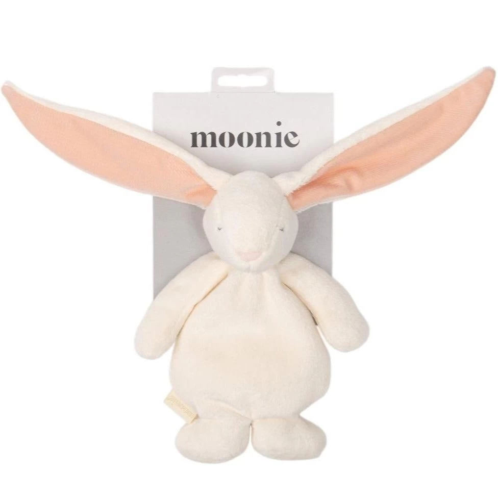 Moonie knuffel sensoric bunny, een lieve konijnen knuffel in creme met peach oren om heerlijk te knuffelen, je baby houdt deze knuffel makkelijk vast.
