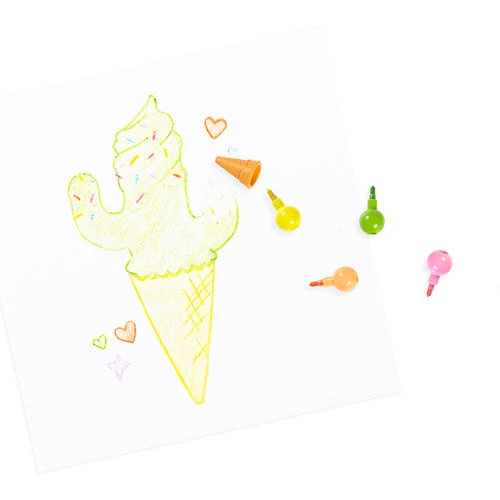 Stapelbare OOLY wasco’s is een kleurpotlood met 6 verschillende kleuren wasco. Samen vormen ze een ijsje, het hoorntje is een gum met vanille geur!