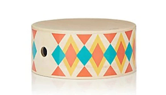De trommel is aan 2 zijden te bespelen, aan de binnenkant zit een metalen raster. Dit zorgt ervoor dat je een vibrerend geluid hoort wanneer je op de trommel slaat. De ritme box heeft een doorsnede van 21 cm en is 9 cm hoog.