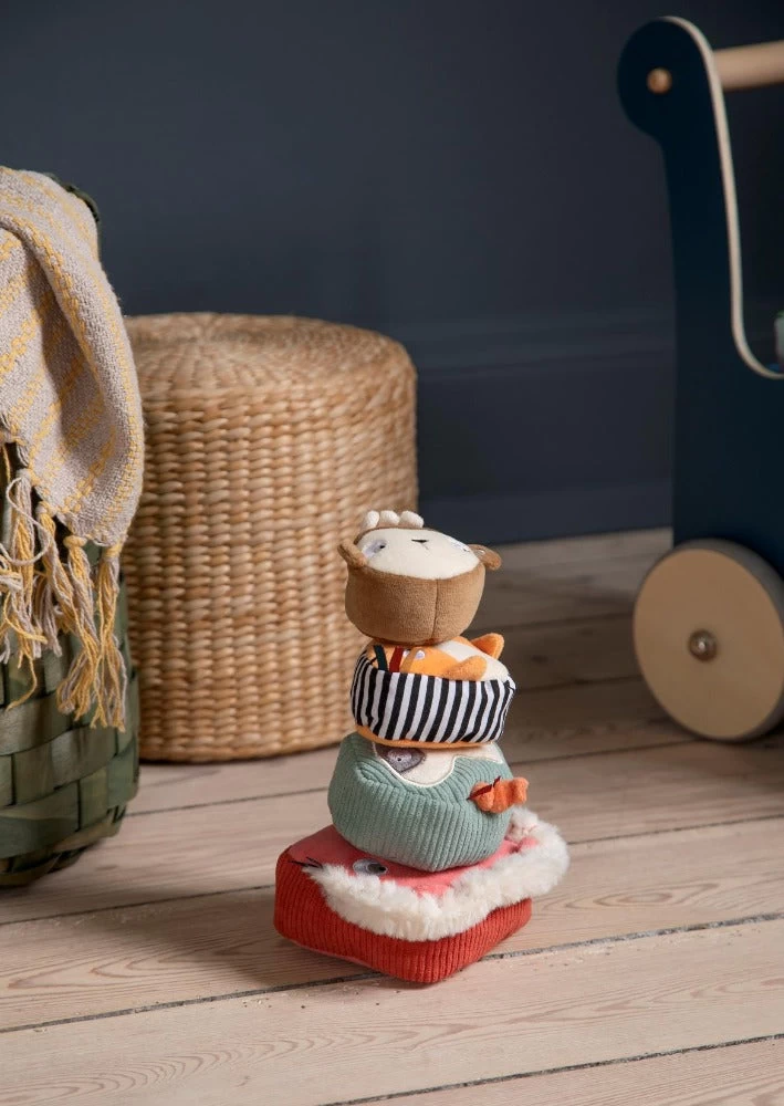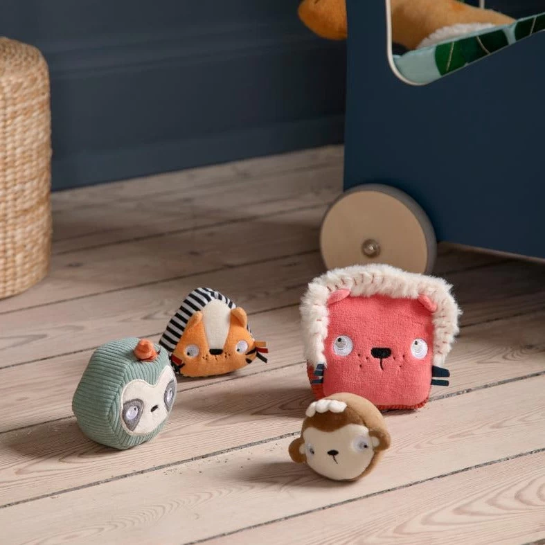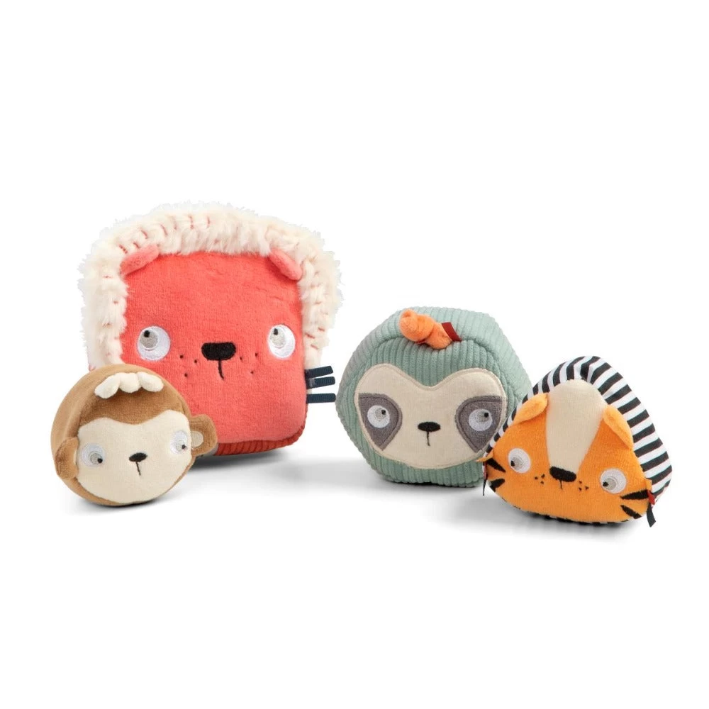 Sebra activiteiten blokken van stof in verschillende geometrische vormen. De Aap, leeuw, luiaard en tijger kraken, rammelen en schudden, er is vanalles te ontdekken! Stapel de 4 verschillende dieren en ontdek welk activiteitenspeelgoed ze verstopt hebben.