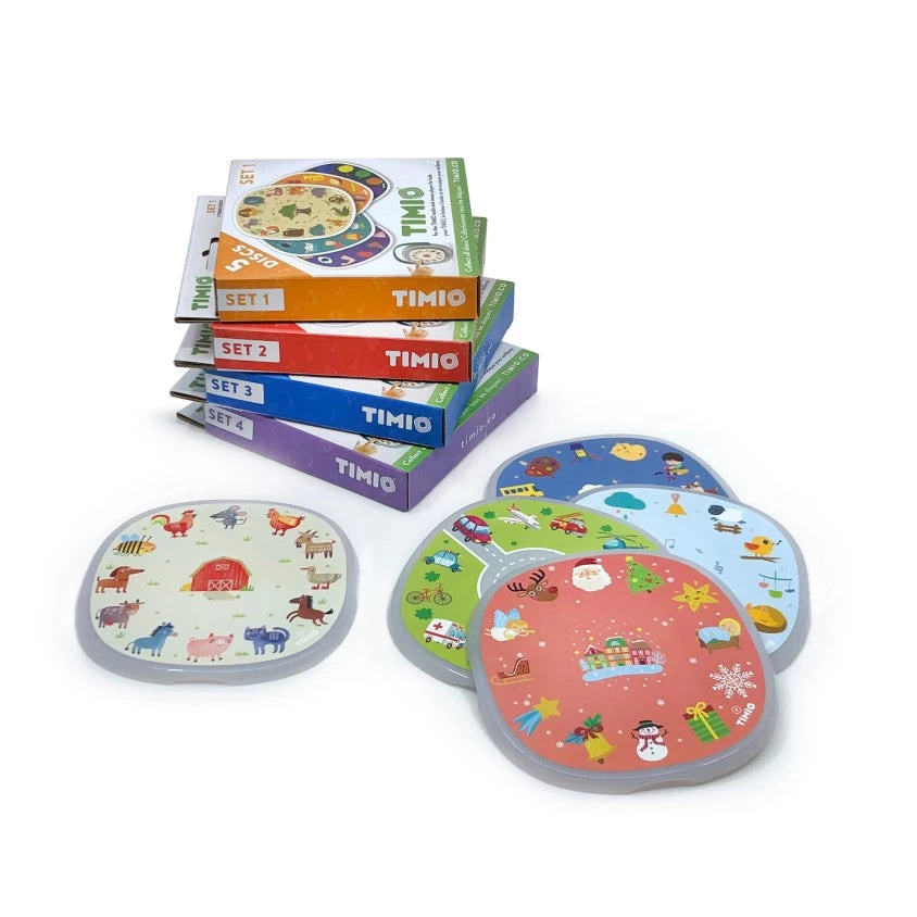 TIMIO Audio- en muziekspeler uitbreidingsset set 1, 5 discs voor het leren van kleuren, lichaamsdelen, muziekinstrumenten, wilde dieren en kinderliedjes in 8 talen. Nederlands, Frans, Engels, Duits, Spaans, Mandarijn, Italiaans en Portugees. De uitbreidingsset is geschikt voor de TIMIO audio- en muziekspeler voor kinderen van 2 t/m 6 jaar. Luister naar sprookjes, slaapliedjes en muziek, oefen met cijfers of leer een nieuwe taal.